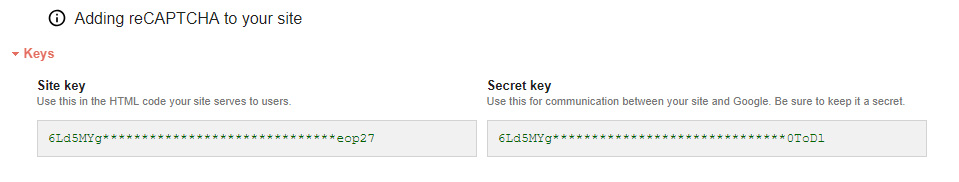 Click on the Register button. You should then be able to see your ReCaptcha keys: