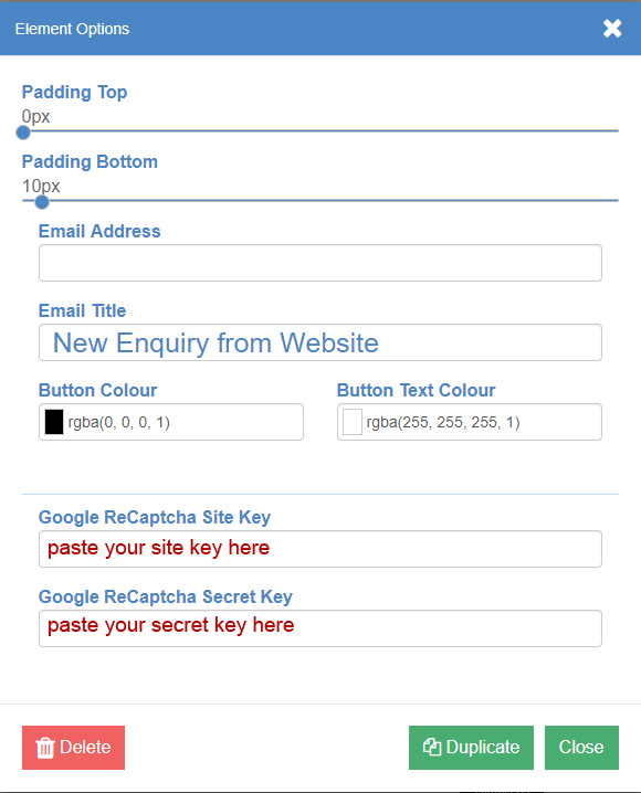 Please note that if you do not see the Google ReCaptcha fields in your configuration dialog, you are probably using an old contact form so you will need to replace it with new contact form element.