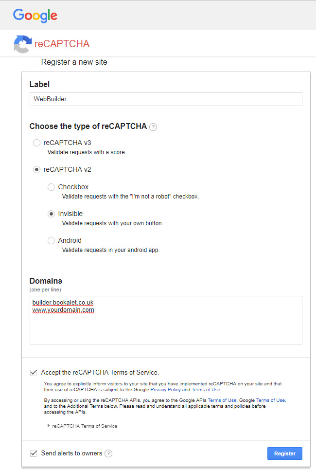 Enter the domains used by your website, also add in Builder.Bookalet.co.uk otherwise your ReCaptcha won't work in preview mode